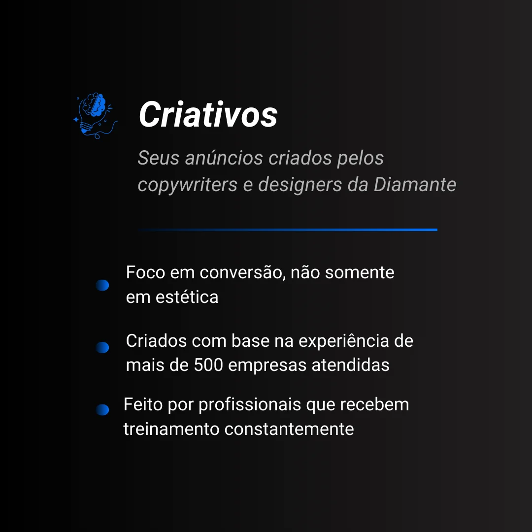 - Criativos focados 100% em conversão, sem métricas de vaidade