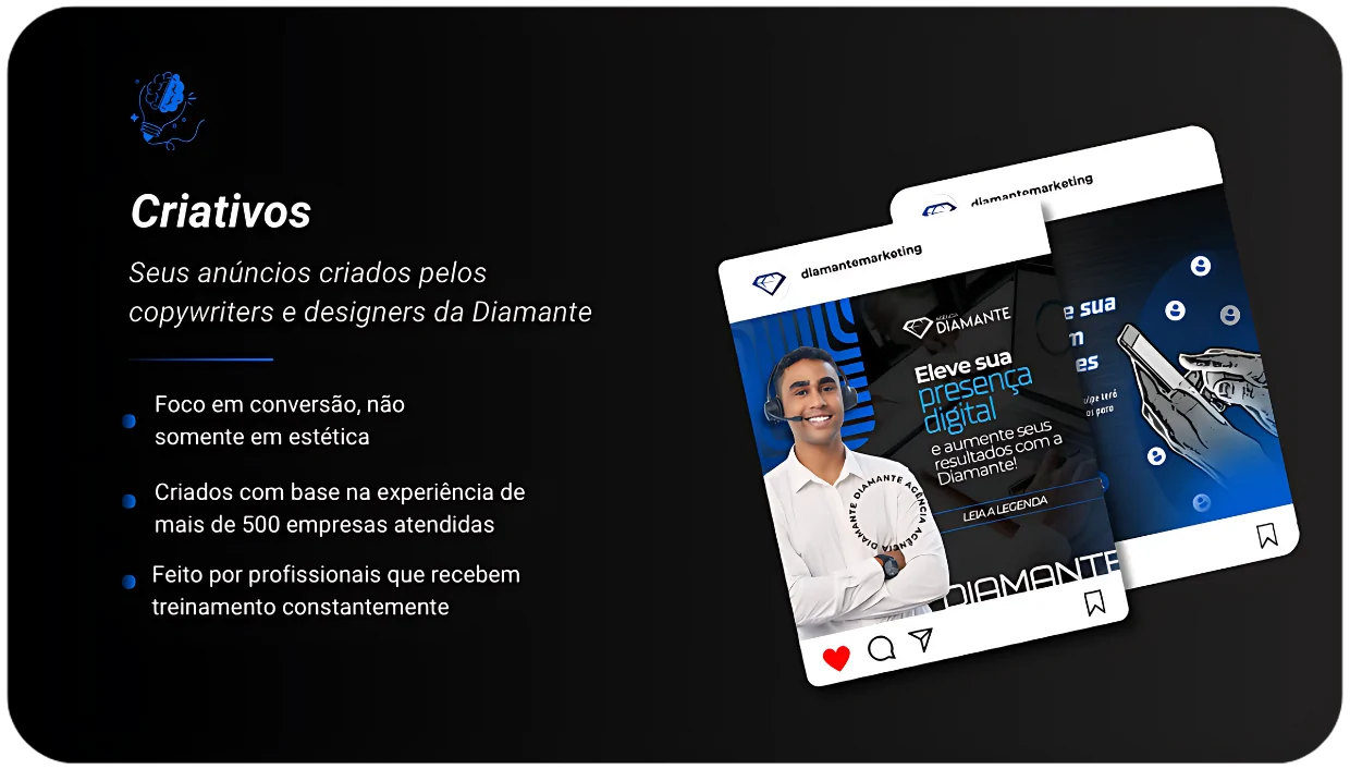 Construção e gestão de criativos estratégicos, com foco em atrair mais clientes e gerar mais receita.